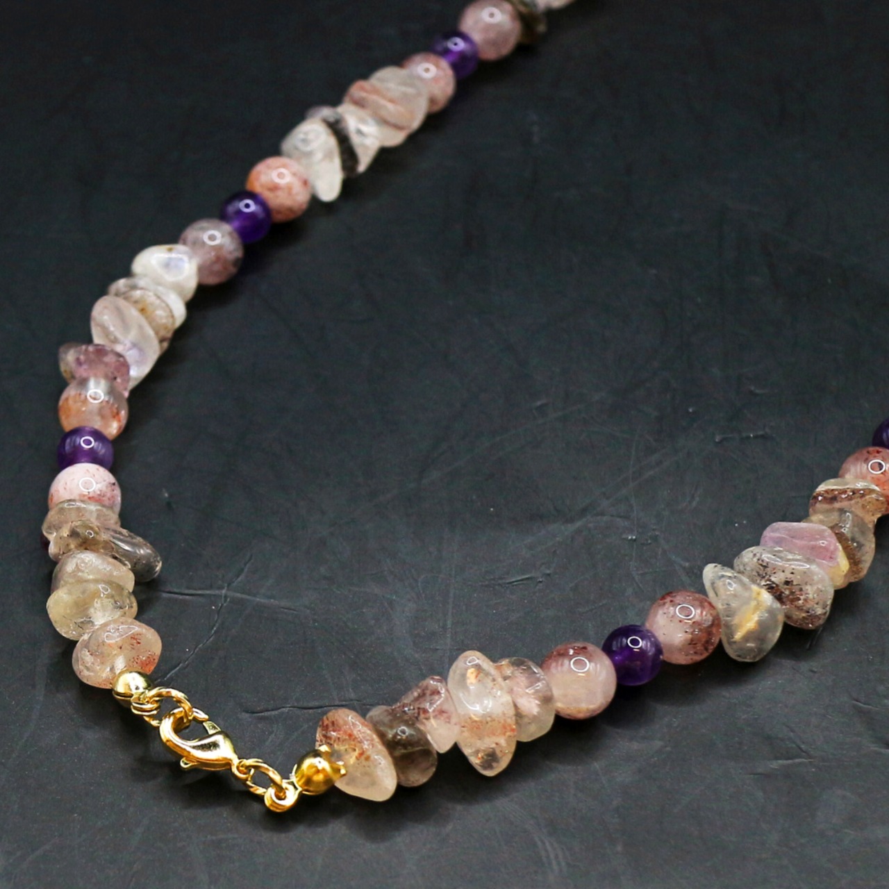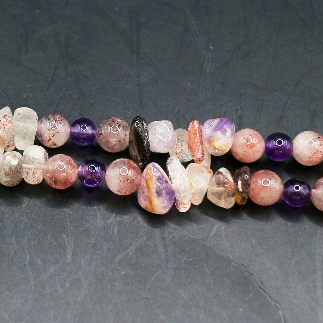 スーパーセブンは、水晶・アメジスト・スモーキークォーツの3種類の石に、ゲーサイト、レピドクロサイト、カコクセナイト、ルチルの4つの内包物が含まれた珍しい鉱物です。