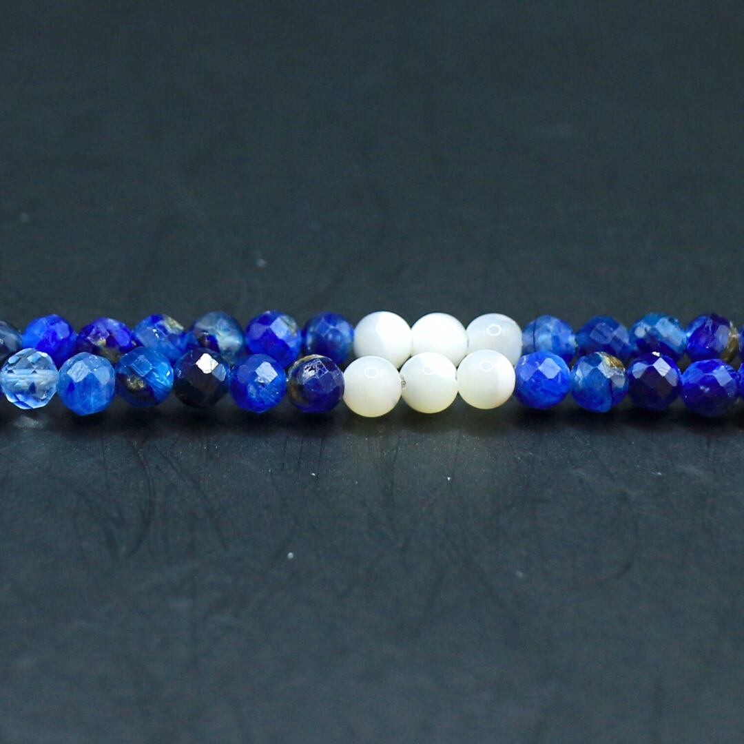 サファイアのようなガラス光沢をもつカイヤナイトに淡水真珠と真珠の母貝から作られたマザーオブパールを組み合わせています。