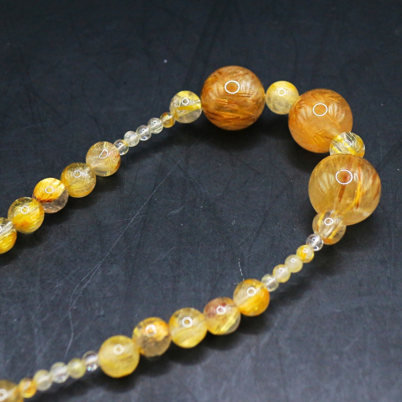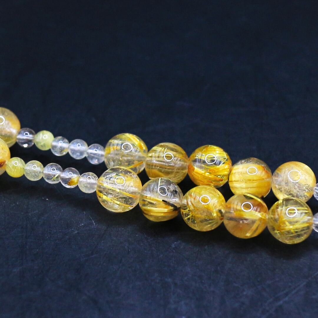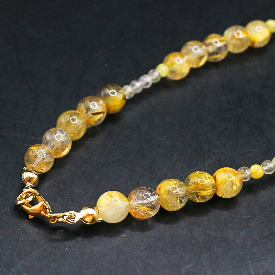 ルチルクォーツは、針や糸の様な細長いルチルという鉱物が内包された水晶で、金色に輝く針が入っていることから日本では『針入り水晶』・『金針水晶』とも呼ばれています。