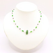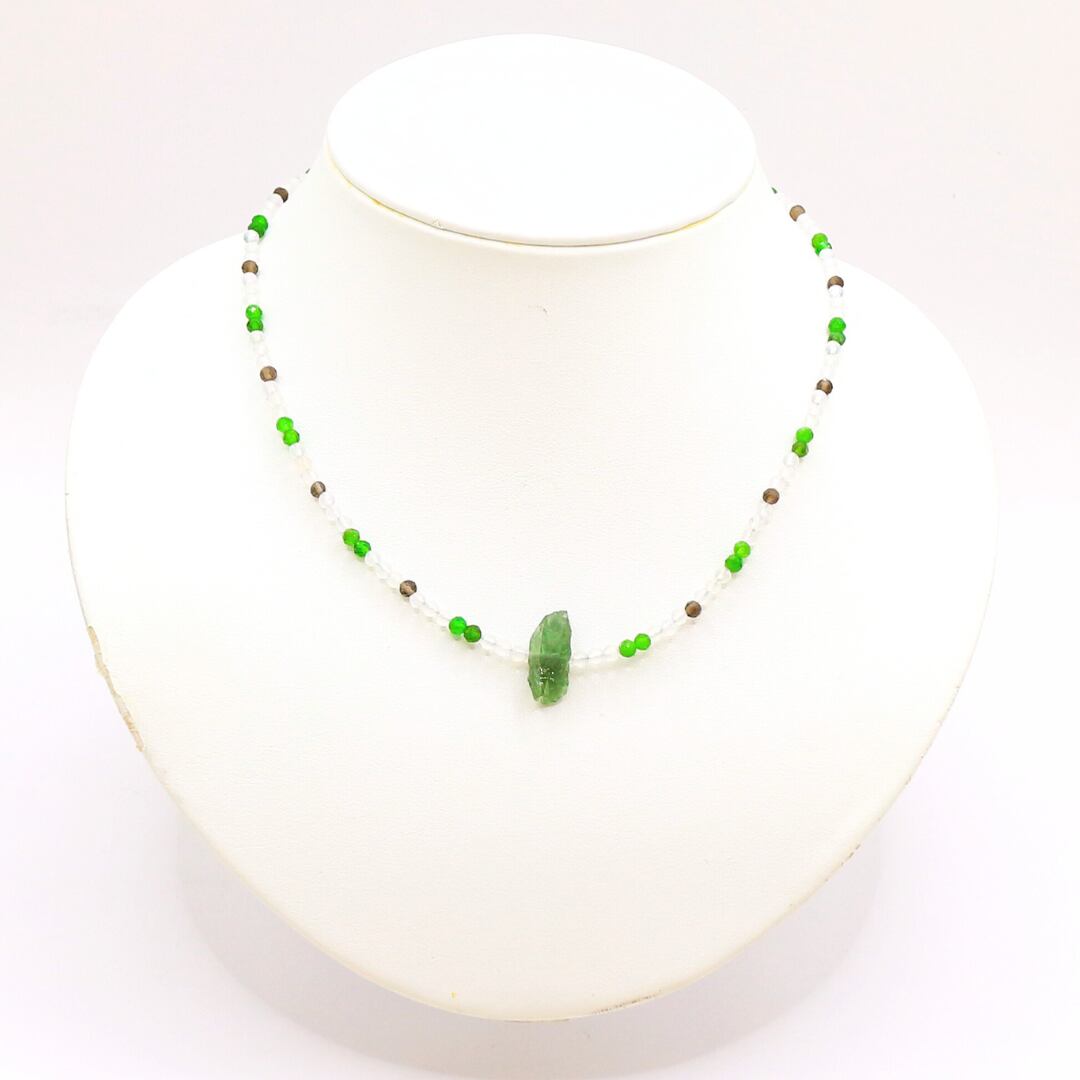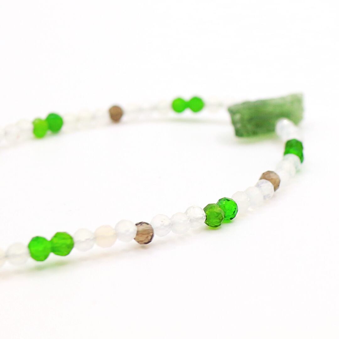 今回は、モルダバイトに乳白色の瑪瑙とクロムダイオプサイト・スモーキークォーツを組み合わせた大地のイメージでネックレスに仕上げました。
