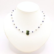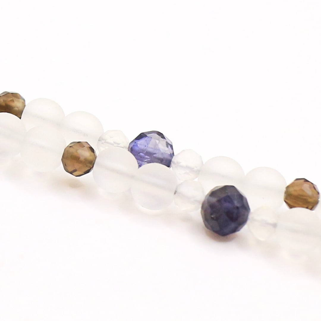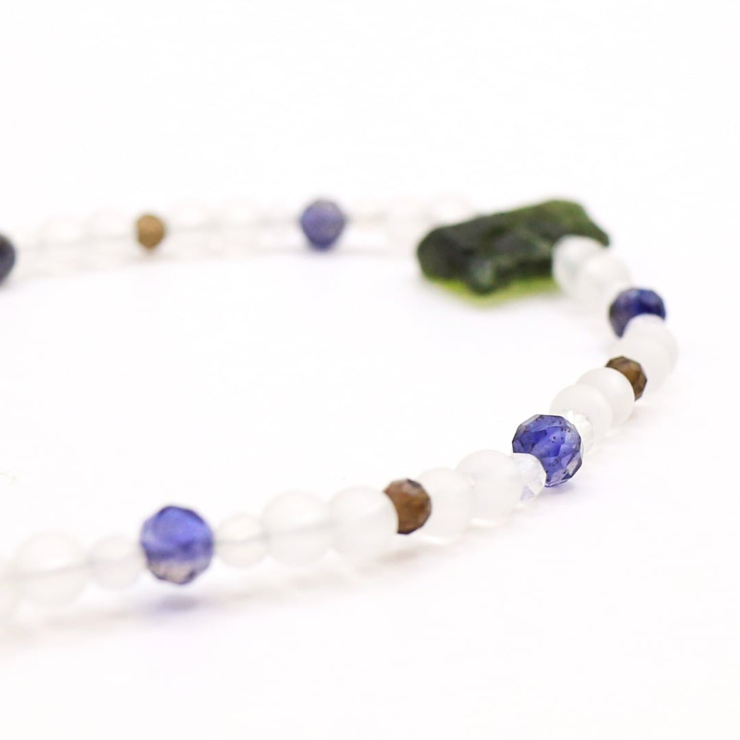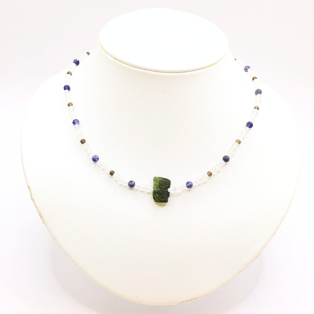 今回は、モルダバイトにすりガラス風加工を施したフロスト水晶とアイオライト・スモーキークォーツを組み合わせたネックレスに仕上げました。