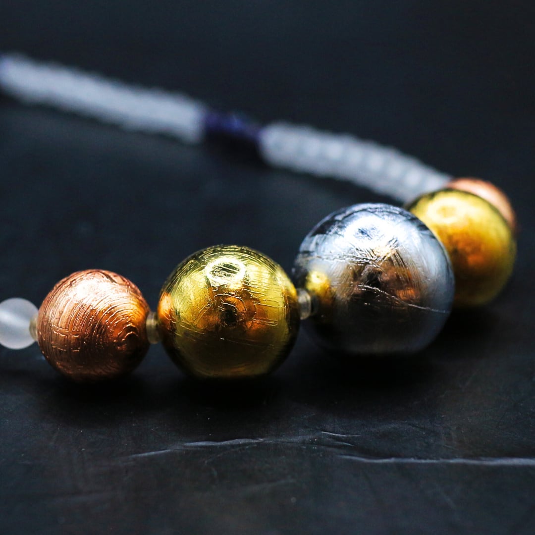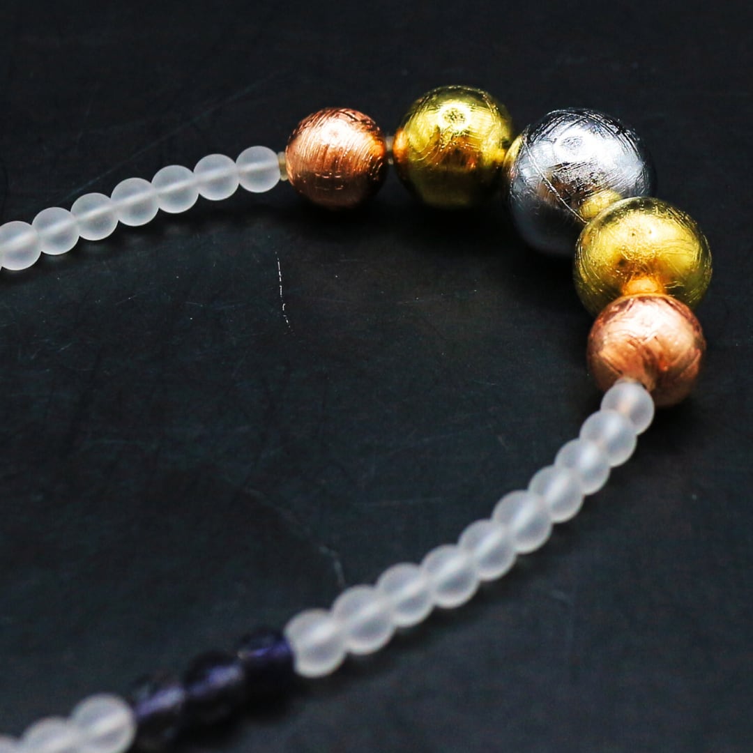 宇宙からやって来た隕石と天然性を組み合わせたビーズネックレス。