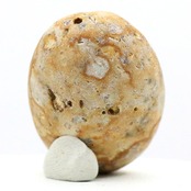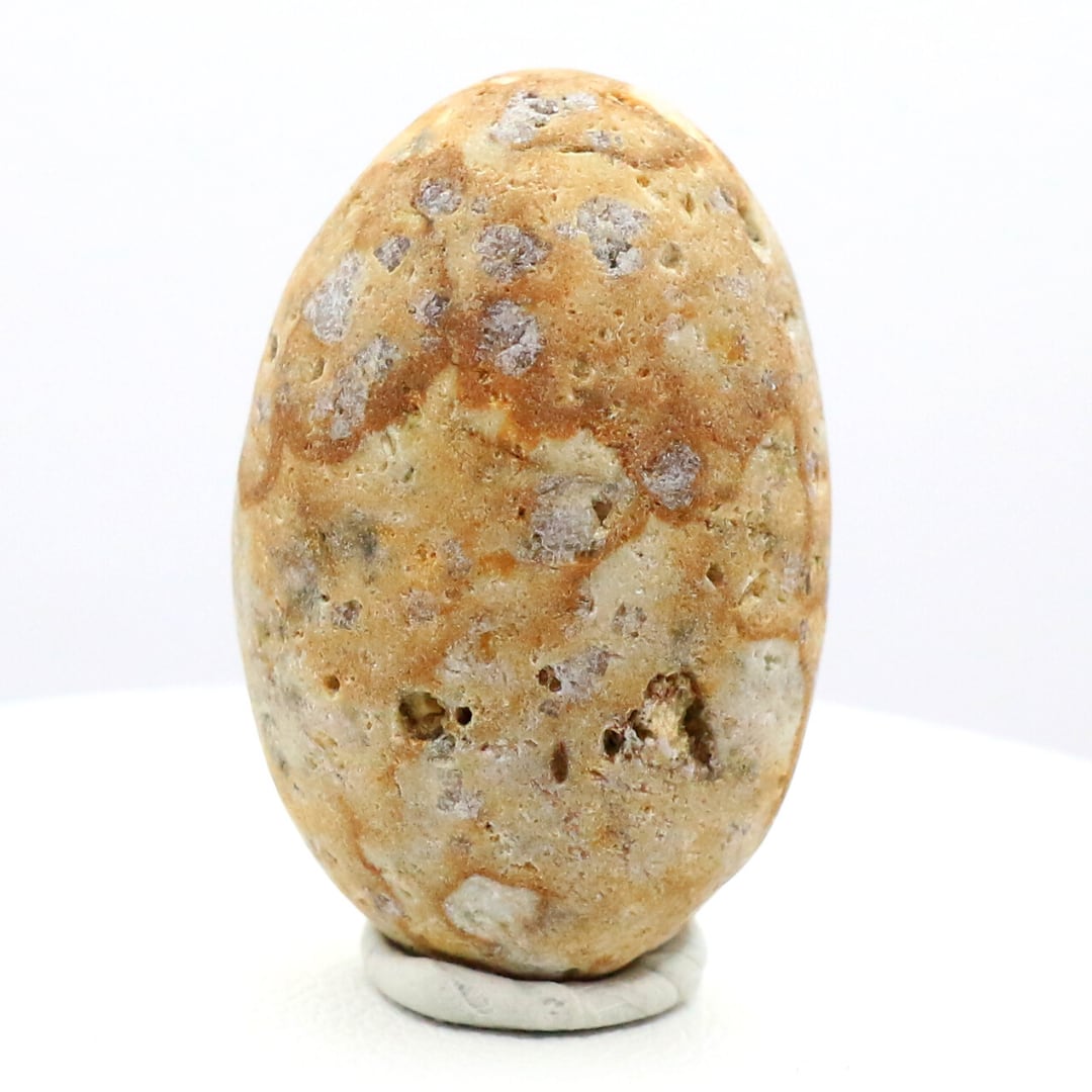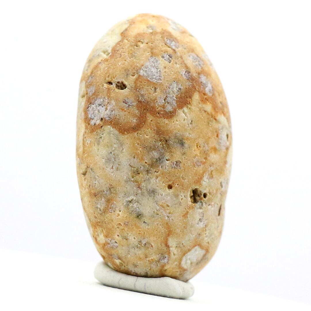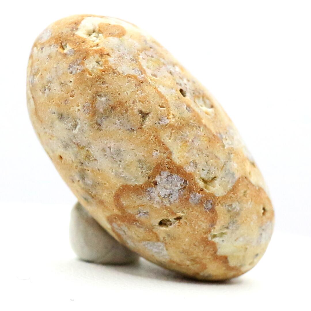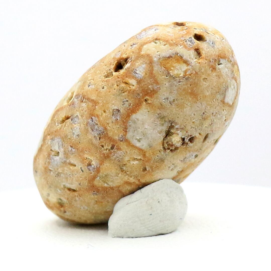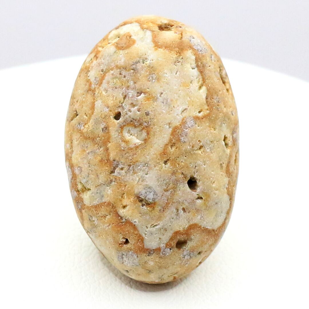 この石の原石をよく観察すると、小さな凹みがあり、かつてその場所には小さな石英の結晶があり、何らかの理由で岩石が河川に流れ込み自然の研磨を経る過程で石英が取れてしまった痕だと言われています。