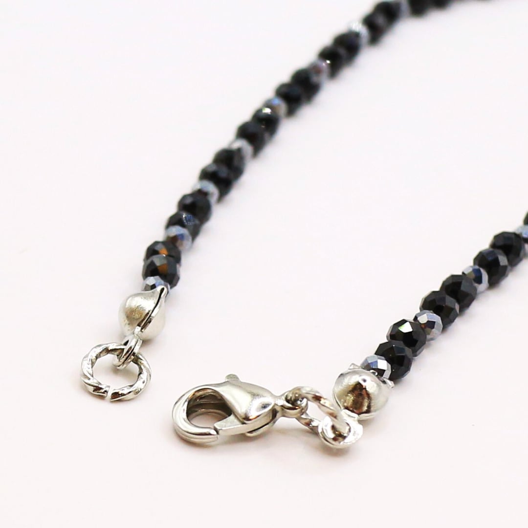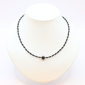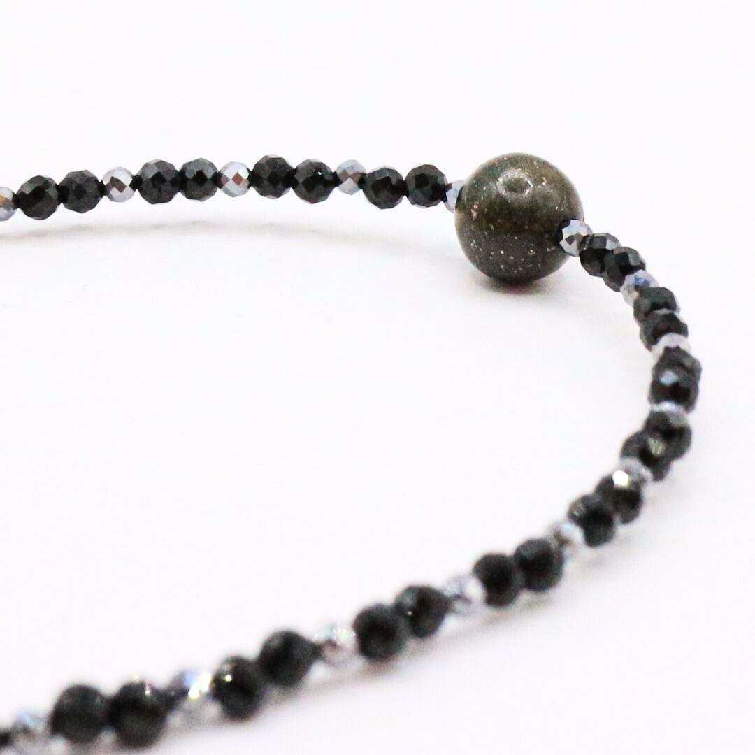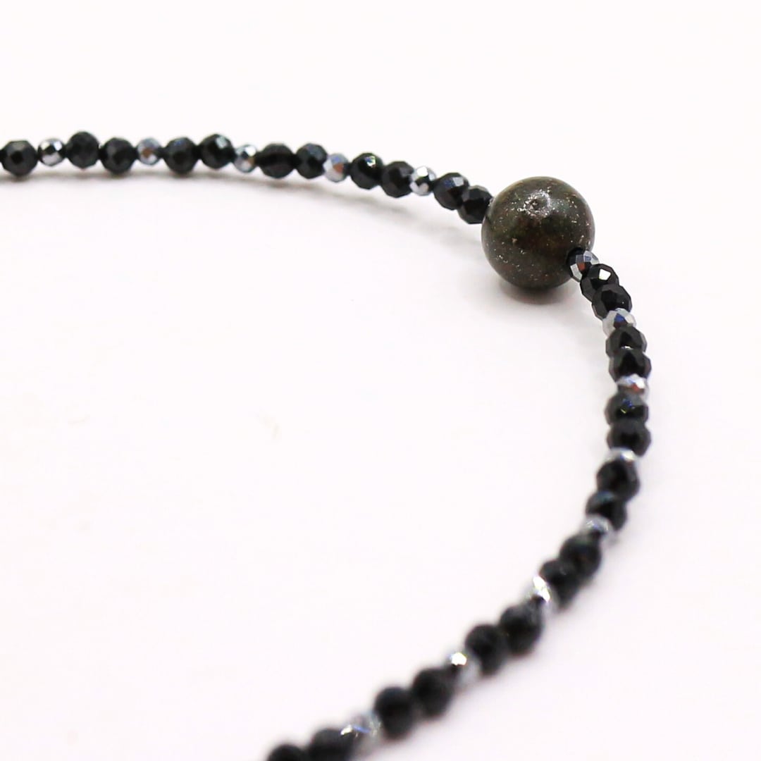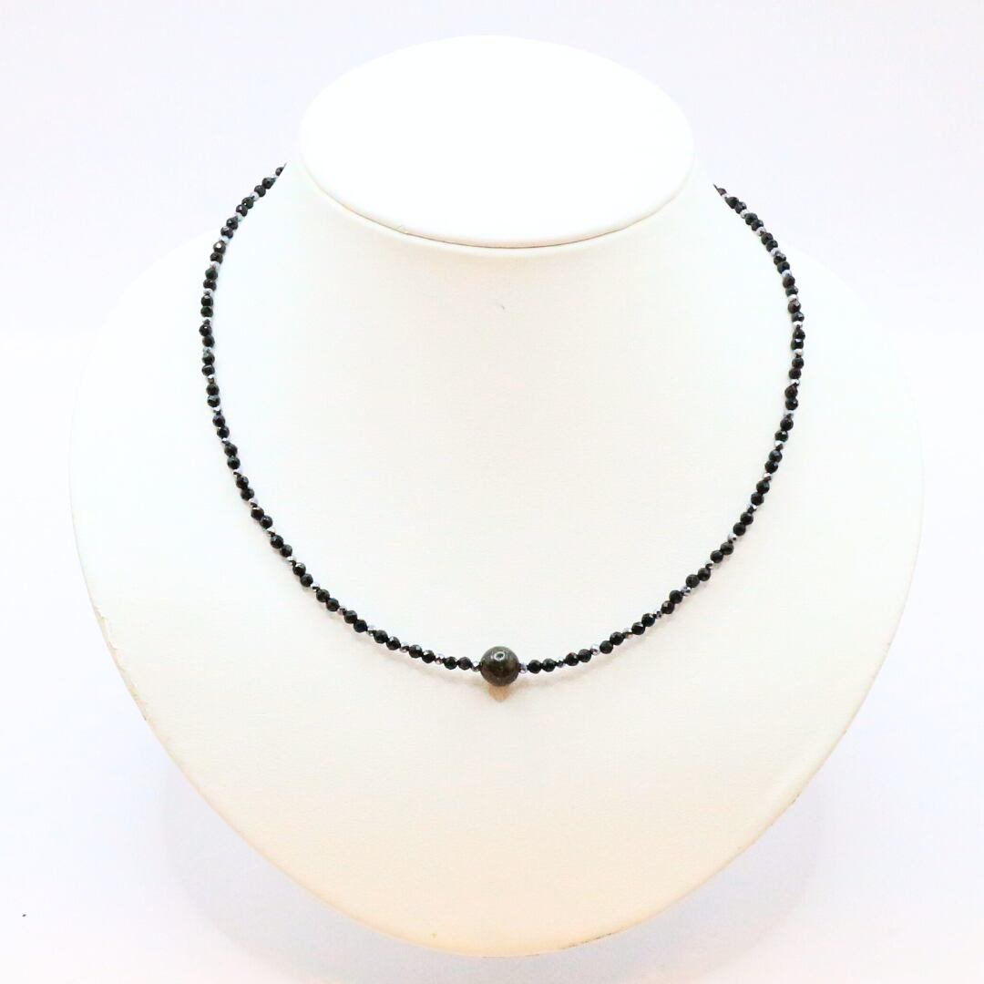 宇宙からやって来た石質隕石とブラックスピネルを組み合わせたビーズネックレス。